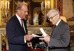 ![]() Bernard d'Espagnat receiving the Templeton Prize from the Duke of Edinburgh, Buckingham Palace in 2009. | |