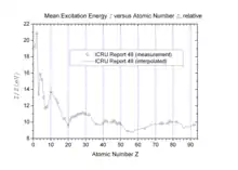 The figure shows normalized values of I, taken from a table.[5] The peaks and valleys in this figure lead to corresponding valleys and peaks in the stopping power. These are called "Z2-oscillations" or "Z2-structure" (where Z2 = Z means the atomic number of the target).