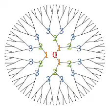Once a vertex is marked as the root, we can group the other vertices into layers based on their distance from the root. The number of vertices at a distance from the root is , as each vertex other than the root is adjacent to vertices at a distance one greater from the root, and the root is adjacent to vertices at a distance 1.