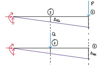 For a simple example let m=1 and n=1. Consider a horizontal beam on which two points have been defined: point 1 and point 2. First we apply a vertical force P at point 1 and measure the vertical displacement of point 2, denoted . Next we remove force P and apply a vertical force Q at point 2, which produces the vertical displacement at point 1 of . Betti's reciprocity theorem states that:
