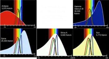 Diagram comparing the approximate black body curves of a number of stars: Antares (a red supergiant), the Sun (a yellow dwarf), Sirius (a white main-sequence star), Spica (a blue star), and Gamma Velorum.
