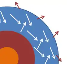 An idealized view of the cross-section of a star. The photosphere contains photons of light nearly in thermal equilibrium, and some escape into space as near-black-body radiation.