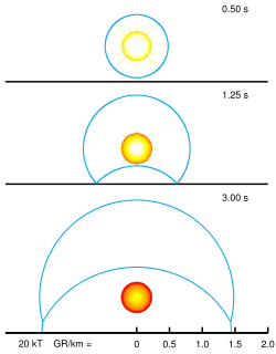where is the density of the air and is the energy that's released by the explosion.[16][17][18] This result allowed G. I. Taylor to estimate the yield of the first atomic explosion in New Mexico in 1945 using only photographs of the blast, which had been published in newspapers and magazines.[9] The yield of the explosion was determined by using the equation: ,