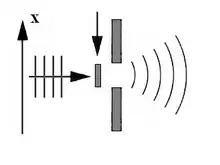 Figure D. A wave extended longitudinally passes through a slit which remains open only for a brief interval of time. Beyond the slit, there is a spatially limited wave in the direction of propagation.