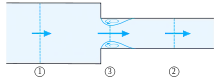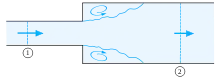 Flow through a sudden contraction of the pipe diameter, with flow separation bubbles near cross section 3.