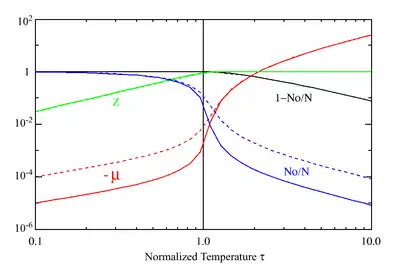 It can be seen that each of these parameters become linear in τα in the limit of low temperature and, except for the chemical potential, linear in 1/τα in the limit of high temperature. As the number of particles increases, the condensed and excited fractions tend towards a discontinuity at the critical temperature.