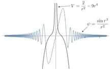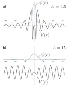 In the work of von Neumann and Wigner [4] two types of spherically symmetric potentials are considered, with the potential of localization occurs due to the "reflection" from infinity (since the material point goes to infinity for a finite time, rolling down from this potential, and the probability of being there tends to zero). A similar example in 1D considers the exponential dependence of the potential.[5] The second type of potential[6][7] has a complex shape, but is periodically modulated with period . A wave function with period is reflected from such a potential to the center in analogy to the reflection from a Bragg mirror. In the one-dimensional case, such potentials can be realized using superlattices.[8][9] |