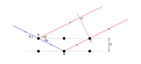 Suppose that a plane wave (of any type) is incident on planes of lattice points, with separation , at an angle as shown in the Figure. Points A and C are on one plane, and B is on the plane below. Points ABCC' form a quadrilateral.