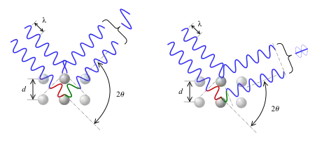 Bragg diffraction occurs when radiation of a wavelength λ comparable to atomic spacings is scattered in a specular fashion (mirror-like reflection) by planes of atoms in a crystalline material, and undergoes constructive interference.[10] When the scattered waves are incident at a specific angle, they remain in phase and constructively interfere. The glancing angle θ (see figure on the right, and note that this differs from the convention in Snell's law where θ is measured from the surface normal), the wavelength λ, and the "grating constant" d of the crystal are connected by the relation:[11]: 1026