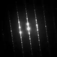 The Bragg condition is correct for very large crystals. Because the scattering of X-rays and neutrons is relatively weak, in many cases quite large crystals with sizes of 100 nm or more are used. While there can be additional effects due to crystal defects, these are often quite small. In contrast, electrons interact thousands of times more strongly with solids than X-rays,[5] and also lose energy (inelastic scattering).[14] Therefore samples used in transmission electron diffraction are much thinner. Typical diffraction patterns, for instance the Figure, show spots for different directions (plane waves) of the electrons leaving a crystal. The angles that Bragg's law predicts are still approximately right, but in general there is a lattice of spots which are close to projections of the reciprocal lattice that is at right angles to the direction of the electron beam. (In contrast, Bragg's law predicts that only one or perhaps two would be present, not simultaneously tens to hundreds.) With low-energy electron diffraction where the electron energies are typically 30-1000 electron volts, the result is similar with the electrons reflected back from a surface.[15] Also similar is reflection high-energy electron diffraction which typically leads to rings of diffraction spots.[16]