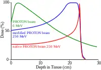 When a fast charged particle moves through matter, it ionizes atoms of the material and deposits a dose along its path. A peak occurs because the interaction cross section increases as the charged particle's energy decreases. Energy lost by charged particles is inversely proportional to the square of their velocity, which explains the peak occurring just before the particle comes to a complete stop.[2] In the upper figure, it is the peak for alpha particles of 5.49 MeV moving through air. In the lower figure, it is the narrow peak of the "native" proton beam curve which is produced by a particle accelerator of 250 MeV. The figure also shows the absorption of a beam of energetic photons (X-rays) which is entirely different in nature; the curve is mainly exponential.