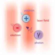 The multiphoton Breit–Wheeler process, also referred to as nonlinear Breit–Wheeler or strong field Breit–Wheeler in the literature, occurs when a high-energy probe photon decays into pairs propagating through a strong electromagnetic field (for example, a laser pulse).[2] In contrast with the linear process, this can take the form of γ + n ω → e+ e, where n represents the number of photons, and ω represents the coherent laser field.