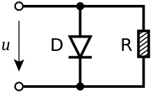 Léon Brillouin in 1950 discussed an electrical circuit analogue that uses a rectifier (such as a diode) instead of a ratchet.[11] The idea was the diode would rectify the Johnson noise thermal current fluctuations produced by the resistor, generating a direct current which could be used to perform work. In the detailed analysis it was shown that the thermal fluctuations within the diode generate an electromotive force that cancels the voltage from rectified current fluctuations. Therefore, just as with the ratchet, the circuit will produce no useful energy if all the components are at thermal equilibrium (at the same temperature); a DC current will be produced only when the diode is at a lower temperature than the resistor.[12]