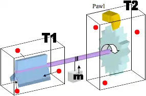 The device consists of a gear known as a ratchet that rotates freely in one direction but is prevented from rotating in the opposite direction by a pawl. The ratchet is connected by an axle to a paddle wheel that is immersed in a fluid of molecules at temperature . The molecules constitute a heat bath in that they undergo random Brownian motion with a mean kinetic energy that is determined by the temperature. The device is imagined as being small enough that the impulse from a single molecular collision can turn the paddle. Although such collisions would tend to turn the rod in either direction with equal probability, the pawl allows the ratchet to rotate in one direction only. The net effect of many such random collisions would seem to be that the ratchet rotates continuously in that direction. The ratchet's motion then can be used to do work on other systems, for example lifting a weight (m) against gravity. The energy necessary to do this work apparently would come from the heat bath, without any heat gradient (i.e. the motion leeches energy from the temperature of the air). Were such a machine to work successfully, its operation would violate the second law of thermodynamics, one form of which states: "It is impossible for any device that operates on a cycle to receive heat from a single reservoir and produce a net amount of work."