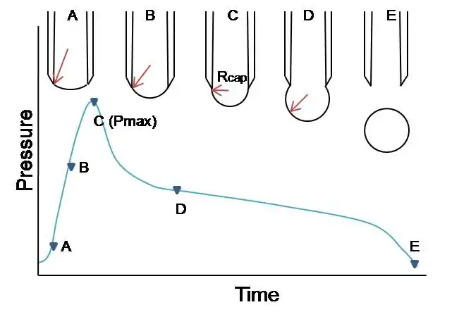 The pressure (P) inside of the gas bubble continues to increase and the maximum value is obtained when the bubble has the completely hemispherical shape whose radius is exactly corresponding to the radius of the capillary.[3]