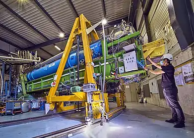 The RADES started searching for axion-like dark matter in 2018, and the first results from this detector were published in early 2021. Although no significant axion signal was detected above the noise background during the 2018 to 2021 period, RADES became the first detector to search for axions above . CAST helioscope (looks at sun) was made a haloscope (looks at galactic halo) in late 2017.[7] RADES detector attached to this haloscope has a 1 m long alternating-irises stainless-steel cavity able to search for dark matter axions around . Further prospects of improving the detector system with enhancements such as superconductive cavities and ferro-magnetic tunings are being looked into.[16][7]