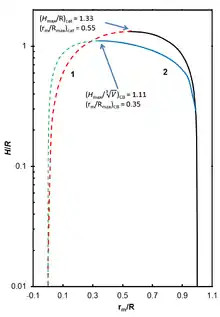 In contrast to cases with increasing height of capillary bridges, that poses variety of profile shapes, the flattening (thinning) toward zero thickness has much more universal character. The universality appears when H<<R (fig. 1). Equation (11) may be written:[31]