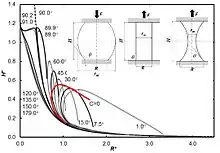 where , dimensionless radius at the contact is and θ is the contact angle. The relation shows that capillary pressure can be positive or negative. The shape of capillary bridges is governed by the equation:[2]