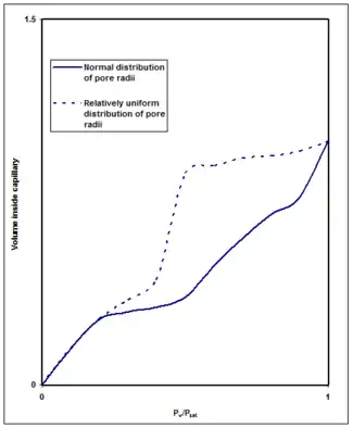Pores that are not of the same size will fill at different values of pressure, with the smaller ones filling first.[2] This difference in filling rate can be a beneficial application of capillary condensation. Many materials have different pore sizes with ceramics being one of the most commonly encountered. In materials with different pore sizes, curves can be constructed similar to Figure 7. A detailed analysis of the shape of these isotherms is done using the Kelvin equation. This enables the pore size distribution to be determined.[2] While this is a relatively simple method of analyzing the isotherms, a more in depth analysis of the isotherms is done using the BET method. Another method of determining the pore size distribution is by using a procedure known as Mercury Injection Porosimetry. This uses the volume of mercury taken up by the solid as the pressure increases to create the same isotherms mentioned above. An application where pore size is beneficial is in regards to oil recovery.[13] When recovering oil from tiny pores, it is useful to inject gas and water into the pore. The gas will then occupy the space where the oil once was, mobilizing the oil, and then the water will displace some of the oil forcing it to leave the pore.[13]