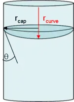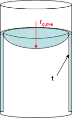 It is also worthy to mention that different pore geometries result in different types of curvature. In scientific studies of capillary condensation, the hemispherical meniscus situation (that resulting from a perfectly cylindrical pore) is most often investigated due to its simplicity.[5] Cylindrical menisci are also useful systems because they typically result from scratches, cuts, and slit-type capillaries in surfaces. Many other types of curvature are possible and equations for the curvature of menisci are readily available at numerous sources.[5][10] Those for the hemispherical and cylindrical menisci are shown below.