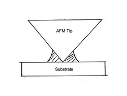 Capillary condensation bridges two surfaces together, with the formation of a meniscus, as is stated above. In the case of atomic-force microscopy (AFM) a capillary bridge of water can form between the tip and the surface, especially in cases of a hydrophilic surface in a humid environment when the AFM is operated in contact mode. While studies have been done on the formation of the meniscus between the tip and the sample, no specific conclusion can be drawn as to the optimum height away from the sample the tip can be without meniscus formation. Scientific studies have been done on the relationship between relative humidity and the geometry of the meniscus created by capillary condensation. One particular study, done by Weeks,[8] illustrated that with the increase in relative humidity, there is a large increase in the size of the meniscus. This study also states that no meniscus formation is observed when the relative humidity is less than 70%, although there is uncertainty in this conclusion due to limits of resolution.