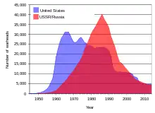 Sagan remained hopeful that the natural NEO impact threat and the intrinsically double-edged essence of the methods to prevent these threats would serve as a "new and potent motivation to maturing international relations."[88][90] Later acknowledging that, with sufficient international oversight, in the future a "work our way up" approach to implementing nuclear explosive deflection methods could be fielded, and when sufficient knowledge was gained, to use them to aid in mining asteroids.[89] His interest in the use of nuclear detonations in space grew out of his work in 1958 for the Armour Research Foundation's Project A119, concerning the possibility of detonating a nuclear device on the lunar surface.[91]