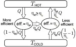 Consider two engines, and , which are irreversible and reversible respectively. We construct the machine shown in the right figure, with driving as a heat pump. Then if is more efficient than , the machine will violate the second law of thermodynamics. Since a Carnot heat engine is a reversible heat engine, and all reversible heat engines operate with the same efficiency between the same reservoirs, we have the first part of Carnot's theorem: