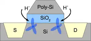Surface defects can always be "passivated" with atoms to purposefully occupy the corresponding energy levels so that conduction electrons cannot scatter into these states (effectively decreasing n in Eq (10)). For example, Si passivation at the channel/oxide interface of a MOSFET with hydrogen (Figure 4) is a typical procedure to help reduce the ~1010 cm−2 defect density by up to a factor of 12[4] thereby improving mobility and, hence, switching speeds. Removal of intermediary states which would otherwise reduce tunneling barriers also decreases gate leakage current and increases gate capacitance as well as transient response. The effect is that the Si sp3 bonding becomes fully satisfied. The obvious requirement here is the ability for the semiconductor to oxidize the passivating atom or, Ec-Edb + χ > EI, with the semiconductor electron affinity χ and atom ionization energy EI.