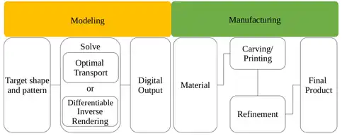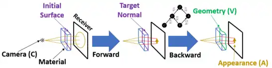 Inverse graphics is a method of observing the data from an image and inferring all possible properties including 3D geometry, lighting, materials, and motion in order to generate a realistic image.[15] In conventional computer graphics, to render an image with desired appearance and effects, it is given all the relevant properties/characteristics. This could be described as the forward method. On the contrary, in caustic design, the properties and characteristics of objects (especially the material surface) are not trivial. The given constraint is the target image to obtain. Therefore, the goal is to obtain its properties and characteristics by observing and inferring the target image. This can be considered the inverse/backward method.