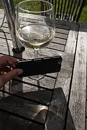 A common situation where caustics are visible is when light shines on a drinking glass. The glass casts a shadow, but also produces a curved region of bright light. In ideal circumstances (including perfectly parallel rays, as if from a point source at infinity), a nephroid-shaped patch of light can be produced.[3][4] Rippling caustics are commonly formed when light shines through waves on a body of water.
