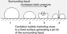 In 1944, Soviet scientists Mark Iosifovich Kornfeld (1908–1993) and L. Suvorov of the Leningrad Physico-Technical Institute (now: the Ioffe Physical-Technical Institute of the Russian Academy of Sciences, St. Petersburg, Russia) proposed that during cavitation, bubbles in the vicinity of a solid surface do not collapse symmetrically; instead, a dimple forms on the bubble at a point opposite the solid surface and this dimple evolves into a jet of liquid. This jet of liquid damages the solid surface.[78] This hypothesis was supported in 1951 by theoretical studies by Maurice Rattray Jr., a doctoral student at the California Institute of Technology.[79] Kornfeld and Suvorov's hypothesis was confirmed experimentally in 1961 by Charles F. Naudé and Albert T. Ellis, fluid dynamicists at the California Institute of Technology.[80]