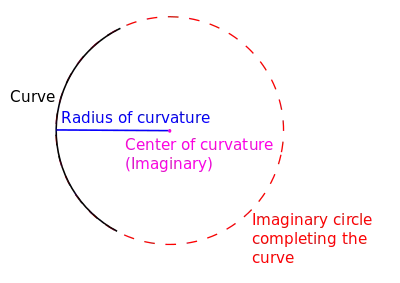 In geometry, the center of curvature of a curve is found at a point that is at a distance from the curve equal to the radius of curvature lying on the normal vector. It is the point at infinity if the curvature is zero. The osculating circle to the curve is centered at the centre of curvature. Cauchy defined the center of curvature C as the intersection point of two infinitely close normal lines to the curve.[1] The locus of centers of curvature for each point on the curve comprise the evolute of the curve. This term is generally used in physics regarding the study of lenses and mirrors (see radius of curvature (optics)).