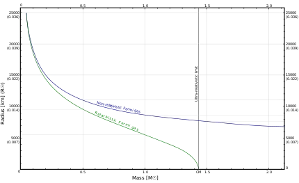 For a fully relativistic treatment, the equation of state used interpolates between the equations P = K1ρ5/3 for small ρ and P = K2ρ4/3 for large ρ. When this is done, the model radius still decreases with mass, but becomes zero at Mlimit. This is the Chandrasekhar limit.[9] The curves of radius against mass for the non-relativistic and relativistic models are shown in the graph. They are colored blue and green, respectively. μe has been set equal to 2. Radius is measured in standard solar radii[10] or kilometers, and mass in standard solar masses.