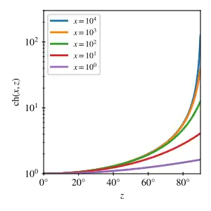 The Chapman function is defined as the ratio between slant depth and vertical column depth . Defining , it can be written as