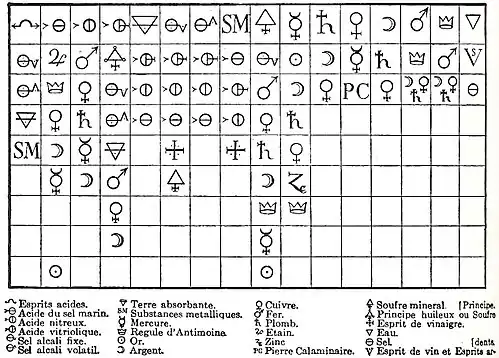 Crucially, the table was the central graphic tool used to teach chemistry to students and its visual arrangement was often combined with other kinds diagrams. Joseph Black, for example, used the table in combination with chiastic and circlet diagrams to visualise the core principles of chemical affinity.[11] Affinity tables were used throughout Europe until the early 19th century when they were displaced by affinity concepts introduced by Claude Berthollet.
