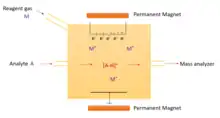 Chemical ionization (CI) is a soft ionization technique used in mass spectrometry.[1][2] This was first introduced by Burnaby Munson and Frank H. Field in 1966.[3] This technique is a branch of gaseous ion-molecule chemistry.[2] Reagent gas molecules (often methane or ammonia)[4] are ionized by electron ionization to form reagent ions, which subsequently react with analyte molecules in the gas phase to create analyte ions for analysis by mass spectrometry. Negative chemical ionization (NCI), charge-exchange chemical ionization, atmospheric-pressure chemical ionization (APCI) and atmospheric pressure photoionization (APPI) are some of the common variants of the technique. CI mass spectrometry finds general application in the identification, structure elucidation and quantitation of organic compounds[5] as well as some utility in biochemical analysis.[5] Samples to be analyzed must be in vapour form, or else (in the case of liquids or solids), must be vapourized before introduction into the source.