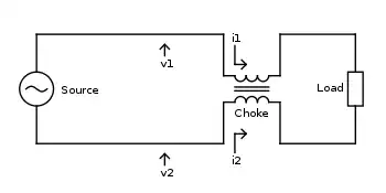 A common-mode (CM) choke is a special application of chokes where it is used to act upon a common-mode signal. These chokes are useful for suppression of electromagnetic interference (EMI) and radio frequency interference (RFI) frequently introduced on high current wires such as on power supply lines, which may cause unwanted operation. Reducing this noise is frequently done by using a common mode choke - two parallel coil windings on a single core. Common mode chokes allow differential currents to pass while blocking signals that are affecting both wires.[3] Because the magnetic flux produced by differential-mode currents in the core of a common mode choke tend to cancel each other out, the choke presents little impedance to differential mode currents. It achieves this by the placement of windings such that they generate equal but opposite fields that cancel each other out for differential mode signals. Normally this also means that the core will not saturate for large differential mode currents, and the maximum current rating is instead determined by the heating effect of the winding resistance. On the other hand, common mode currents see a high impedance path due to the combined inductance of the windings that reinforce each other.