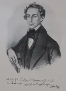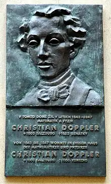 Doppler was born in Salzburg (today Austria) in 1803. Doppler was the second son born to Johann Evangelist Doppler and Theresia Seeleuthner (Doppler). Doppler's father, Johann Doppler, was a third-generation stone mason in Salzburg.[2] As a young boy, Doppler showed promise for his family's trade.[3] However, due to his weak health, Doppler's father encouraged him instead to pursue a career in business. Doppler started elementary education at the age of 13.[4] After completion, he moved on to secondary education at a school in Linz.[4] Doppler's proficiency in mathematics was discovered by Sion Stampfer, a mathematician in Salzburg. Upon the recommendation of Sion Stampfer, Doppler took a break from high school to attend the Polytechnic Institute in Vienna in 1822.[3] Doppler returned to Salzburg in 1825 to finish his secondary education.[2] After completing high school, Doppler studied philosophy in Salzburg and mathematics and physics at the University of Vienna and Imperial–Royal Polytechnic Institute (now TU Wien). In 1829, he was chosen for an assistant position to Professor Adam Von Burg at the Polytechnic Institute of Vienna, where he continued his studies.[5] In 1835, he decided to immigrate to the United States to pursue a position in academia.[6] Before departing for the United States, Doppler was offered a teaching position at a state-operated high school in Prague, which convinced him to stay in Europe.[6] Shortly after, in 1837 he was appointed as an associate professor of math and geometry at the Prague Polytechnic Institute (now Czech Technical University in Prague). He received a full professorship position in 1841.[2]