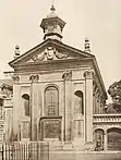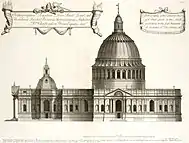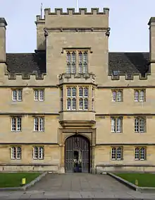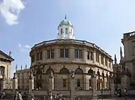 Wren's second, similarly collegiate work followed soon after, when he was commissioned to design Oxford's "New Theatre", financed by Gilbert Sheldon.[46] His design for the structure was met with lukewarm to negative reception, with even Wren's defenders admitting the young architect to have not yet been "capable of handling a large architectural composition with assurance".[16] Adrian Tinniswood credits the building's flaws to "Sheldon's refusal to pay for an elaborate exterior, Wren's inability to find an adequate external expression for a building which was wholly conditioned by the functionality of its interior space and, ...his refusal to bend the knee to classical authority in the way that our experience of eighteenth-century architecture has conditioned us to believe is right."[16] Prior to the theatre's 1669 completion, Wren had received further commissions for the Garden Quadrangle at Trinity College, Oxford, and the chapel of Emmanuel College, Cambridge.[16]