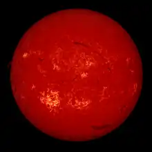 The chromosphere has a characteristic red color due to electromagnetic emissions in the Hα spectral line. Information about the chromosphere is primarily obtained by analysis of its emitted electromagnetic radiation.[1] The chromosphere is also visible in the light emitted by ionized calcium, Ca II, in the violet part of the solar spectrum at a wavelength of 393.4 nanometers (the Calcium K-line).[2]