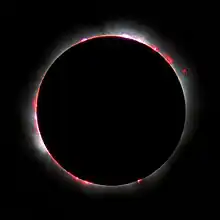 The density of the chromosphere is 10−4 times that of the underlying photosphere and 10−8 times that of the Earth's atmosphere at sea level. This makes the chromosphere normally invisible and it can be seen only during a total eclipse, where its reddish colour is revealed. The colour hues are anywhere between pink and red.[8] Without special equipment, the chromosphere cannot normally be seen due to the overwhelming brightness of the photosphere.