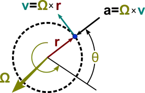 Figure 1: Vector relationships for uniform circular motion; vector Ω representing the rotation is normal to the plane of the orbit.