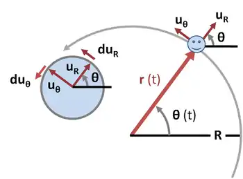 The time derivative of is found the same way as for . Again, is a unit vector and its tip traces a unit circle with an angle that is π/2 + θ. Hence, an increase in angle by implies traces an arc of magnitude , and as is orthogonal to , we have:
