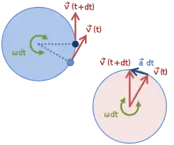 The left-hand circle in Figure 2 is the orbit showing the velocity vectors at two adjacent times. On the right, these two velocities are moved so their tails coincide. Because speed is constant, the velocity vectors on the right sweep out a circle as time advances. For a swept angle = ω dt the change in v is a vector at right angles to v and of magnitude v , which in turn means that the magnitude of the acceleration is given by