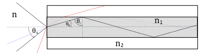 By combining both of these equations it can be seen in the diagram above how is a function of and , where is the index of refraction of the core and