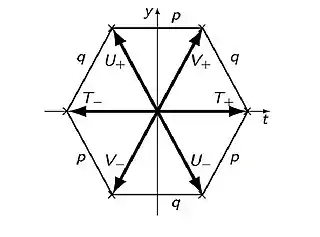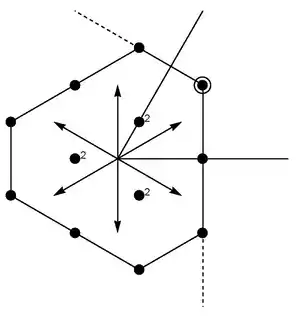 All the other states of the representation can be constructed by the successive application of the ladder operators and and by identifying the base states which are annihilated by the action of the lowering operators. These operators can be pictured as arrows whose endpoints form the vertices of a hexagon (picture for generators above).