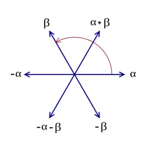 Root system of SU(3). The 6 roots are mutually inclined by π/3 to form a hexagonal lattice: α corresponds to isospin; β to U-spin; and α+β to V-spin.