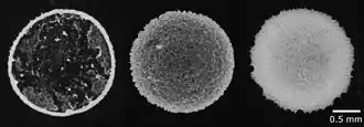 The lower-limit size of a coffee ring depends on the time scale competition between the liquid evaporation and the movement of suspended particles.[16] When the liquid evaporates much faster than the particle movement near a three-phase contact line, coffee ring cannot be formed successfully. Instead, these particles will disperse uniformly on a surface upon complete liquid evaporation. For suspended particles of size 100 nm, the minimum diameter of the coffee ring structure is found to be 10 μm, or about 10 times smaller than the width of human hair. The shape of particles in the liquid is responsible for coffee ring effect.[17][18] On porous substrates, the competition among infiltration, particle motion and evaporation of the solvent governs the final deposition morphology.[19]