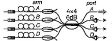 Nonlinear interactions of light waves are used widely to synchronize the laser beams in multichannel optical systems. Self-adjusting of phases may be robustly achievable in binary-tree array of beam-splitters and degenerate four-wave mixing Kerr Phase conjugation[7] in Chirped pulse amplification extreme light facilities.[8] This phase-conjugating Michelson interferometer increases the brightness as ,[9] where is the number of phase-locked channels.
