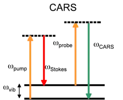 Coherent anti-Stokes Raman spectroscopy, also called Coherent anti-Stokes Raman scattering spectroscopy (CARS), is a form of spectroscopy used primarily in chemistry, physics and related fields. It is sensitive to the same vibrational signatures of molecules as seen in Raman spectroscopy, typically the nuclear vibrations of chemical bonds. Unlike Raman spectroscopy, CARS employs multiple photons to address the molecular vibrations, and produces a coherent signal. As a result, CARS is orders of magnitude stronger than spontaneous Raman emission. CARS is a third-order nonlinear optical process involving three laser beams: a pump beam of frequency ωp, a Stokes beam of frequency ωS and a probe beam at frequency ωpr. These beams interact with the sample and generate a coherent optical signal at the anti-Stokes frequency (ωpr+ωp-ωS). The latter is resonantly enhanced when the frequency difference between the pump and the Stokes beams (ωp-ωS) coincides with the frequency of a Raman resonance, which is the basis of the technique's intrinsic vibrational contrast mechanism.[1][2]